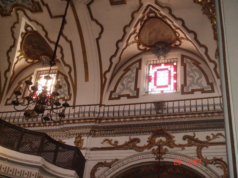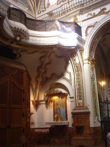 aplicaciones de rocalla; yeserías decoran cada tramo entre los lunetos con pinturas de santos.