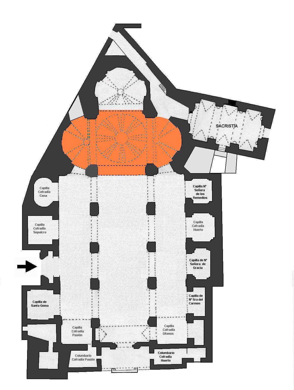 de tipo trebolado, los brazos absidiales de la capilla mayor y crucero se cierran alrededor de la espectacular cúpula, que se alza sobre